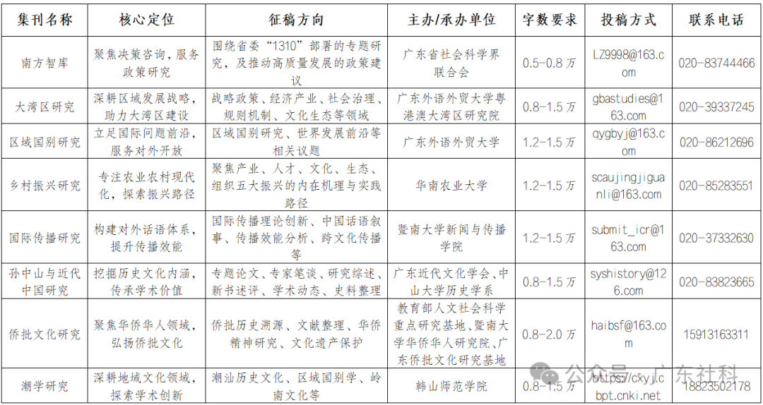 4.更多投稿细节请关注省社科联官网、“广东社科”公众号发布的集刊征稿启事或联系各集刊编辑部咨询,获取最新投稿动态。